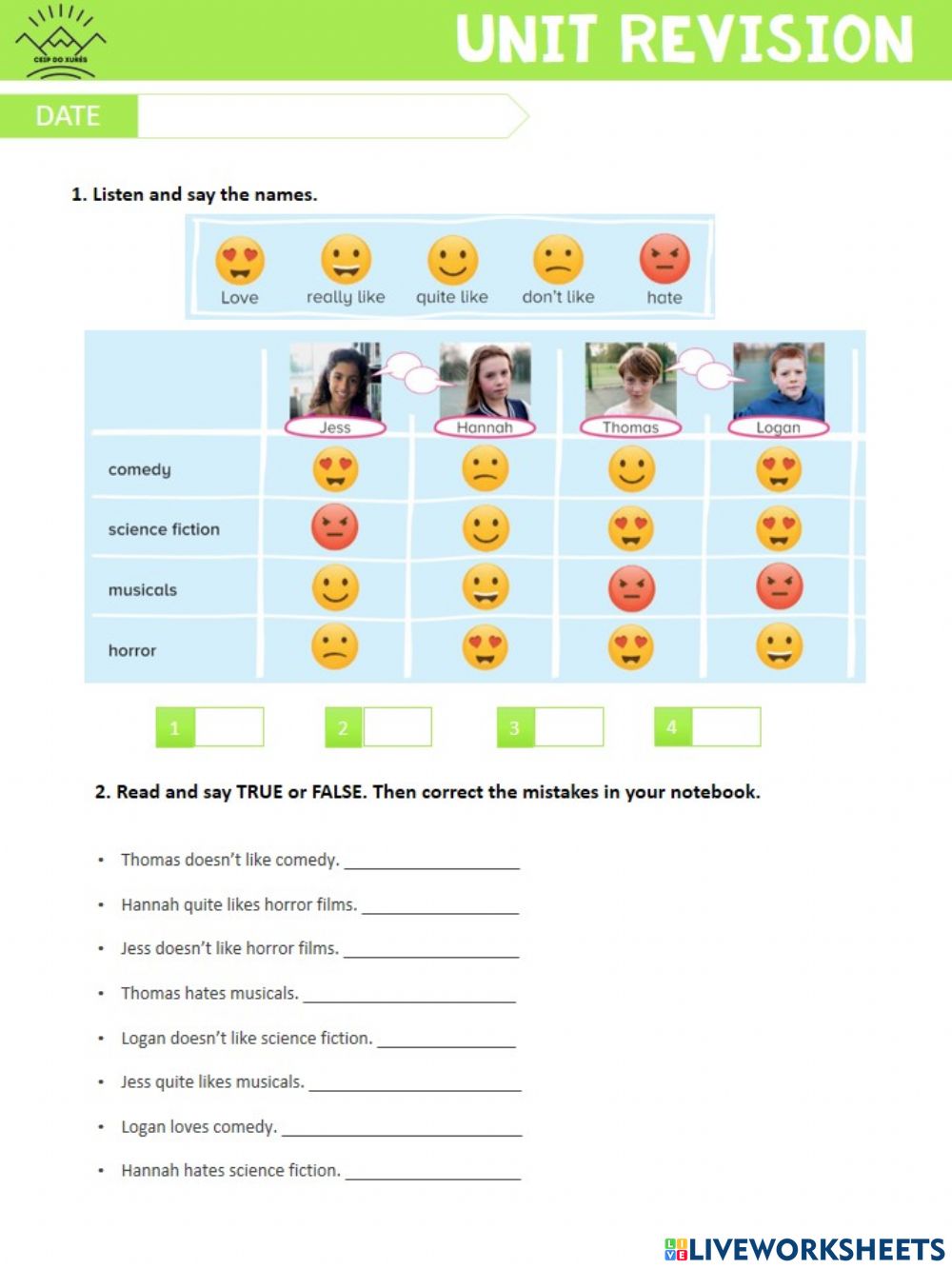 ASSESSMENT - UNIT 3 - GRAMMAR - LIKES AND DISLIKES